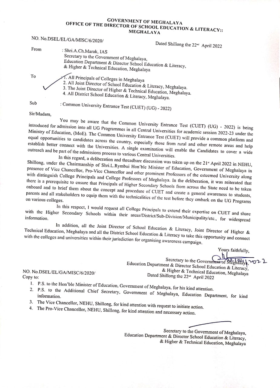- Letter from Director of Higher and Technical Education Government of Meghalaya-CUET